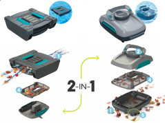 - Великі, легко очищувані контейнери для сміття забезпечують тривалий час роботи перед спорожненням. Пилосос має контейнер об'ємом 3,5 літра, а скімер – 6 літрів.