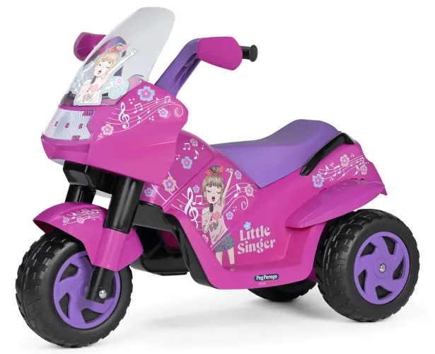 Триколісний електробайк Peg Perego Litle Singer - гарний триколісний мотоцикл в яскравих кольорах для дівчаток від 1 року. Світло, звуки, мелодії, клаксон і безпека італійських матеріалів, найкращі розваги для найменших.