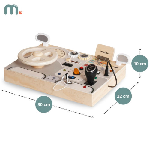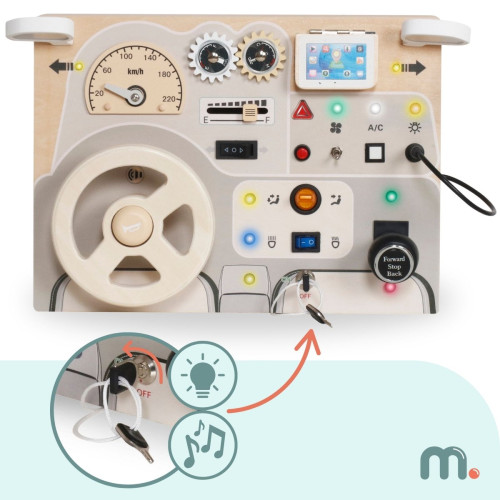 Сенсорно-маніпуляційна дошка Mamabrum Montessori MAM219 BUSY BOARD - ця іграшка дозволить малюкові відчути себе водієм. Час вирушати в дорогу! Достатньо запустити двигун, увімкнути фари і взятися за кермо, щоб почати гру. Виготовлена з дерева панель чудово імітує приладову дошку автомобіля, ефективно стимулюючи уяву малюків і дозволяючи їм наслідувати дорослих.
