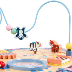 - Набір містить цимбали, барабан, паличку для інструментів, лабіринт з намистинками, фігурки тварин для переміщення по визначеному маршруту, рухомі шестерні та дверцята для гри в «ку-ку»!