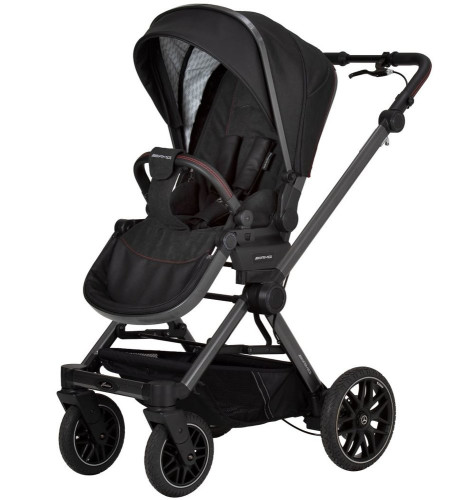 Коляска 2в1 Hartan Mercedes-Benz AMG GT² 850 NIGHT BLACK - в комбінованому чорному кольорі 850 Night Black з простроченими червоними вставками є результатом успішної співпраці двох німецьких компаній: Hartan і підрозділу AMG компанії Mercedes. AMG випускає першу колекцію колясок у стилі тюнінгованого автомобіля з яскравими ознаками гоночного стилю. За підтримки команди дизайнерів Mercedes-Benz AMG і Hartan об'єдналися для створення унікальної моделі коляски, яка поєднує в собі керованість, невелику вагу і максимальний комфорт під час їзди абсолютно особливим чином. При створенні коляски використовуються оригінальні тканини Dinamica, які відповідають найвищим вимогам якості автомобільної промисловості і також використовуються в автомобілях лінійки AMG. Всі коляски за замовчуванням вже обладнані додатковим ручним гальмом і мають в комплекті 2 модулі: люльку класу Преміум і класичний прогулянковий блок GTR з відкидною спинкою. Коляска AMG GT2 має в основі нове шасі, прохідне шасі та вирізняється преміальним дизайном: у комплекті поставляється люлька для новонародженого Premium з регулюванням положення спинки, новий реверсивний, регульований за нахилом прогулянковий блок з відкидною спинкою, сумочка Bag-2-GO, універсальний дощовик на обидва блоки й універсальна антимоскітна сітка. Ручка коляски обтягнута якісною екошкірою з червоною прострочкою і має ручне гальмо для пригальмовування коляски. У колекції 2024 року на ручці з'явилося кріплення під оригінальний підсклянник Hartan, який входить у комплектацію коляски. Коляска Hartan AMG GT2 850 Black колекції 2024 року виконана в чорному кольорі зі стьобаними вставками і червоним прострочуванням. Під час виготовлення коляски використовуються спеціальні тканини Dinamica - такі самі, як і в автомобілях AMG. На люльці та прогулянковому блоці зроблена вишивка логотипів AMG.