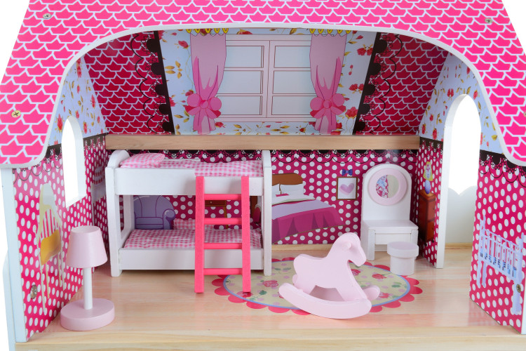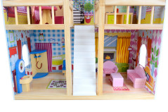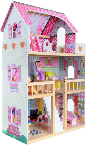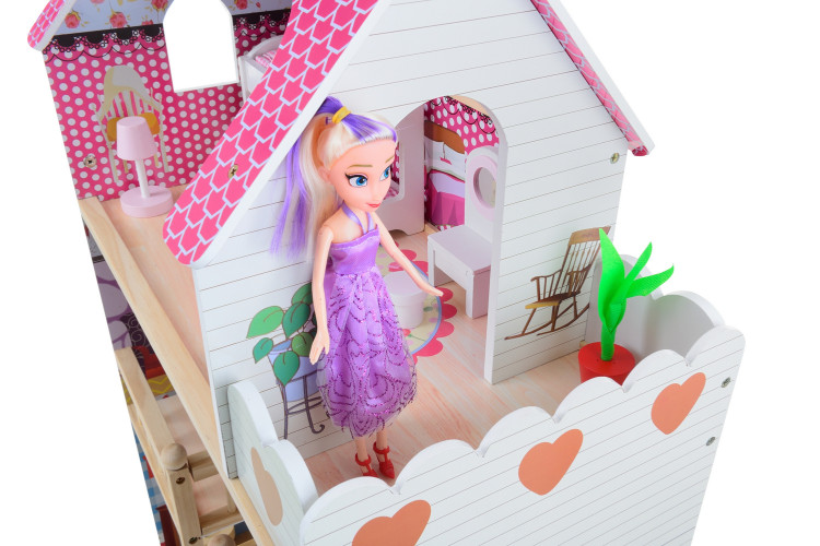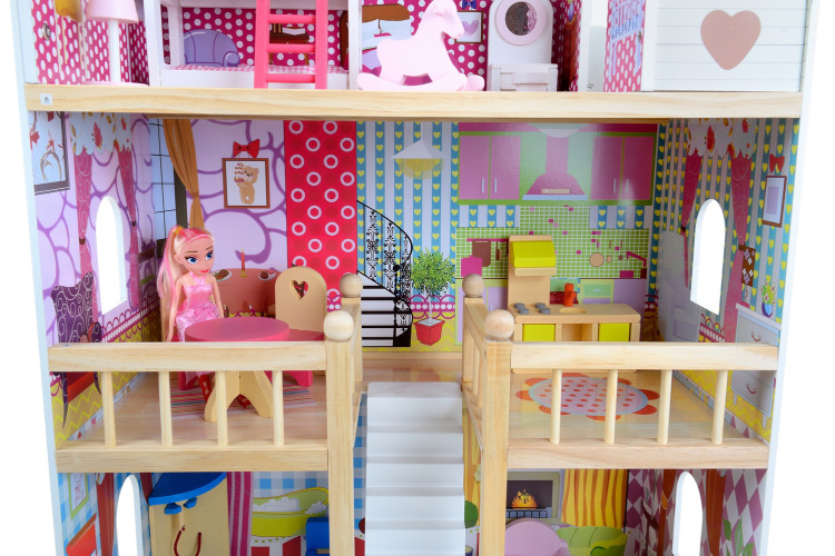 Міцна дерев'яна конструкція дозволить насолоджуватися грою протягом тривалого часу. Гарний триповерховий дерев'яний будиночок для ляльок з терасою повністю обладнаний. У ньому є п'ять великих кімнат, які ваша дитина може обставити відповідно до власної уяви. У комплекті з будиночком є 17 різних меблів та аксесуарів, тож ваша дитина має величезний вибір можливостей для облаштування кімнат. Інтер'єр можна прикрасити світлодіодним освітленням, що входить до комплекту, яке має пульт дистанційного керування для налаштування яскравості та кольору світла.