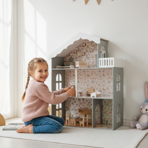 Дерев'яний ляльковий будиночок NUNUKIDS з аксесуарами - кожна маленька принцеса мріє про гарний будиночок для своїх ляльок. Наш будиночок ідеально підійде для цієї ролі! Це продукт, створений навіть для дуже вимогливих маленьких дам! Виготовлений з матеріалів найвищої якості, оснащений усіма необхідними аксесуарами, він стає ідеальним місцем для гри на багато годин. Будиночок має три поверхи та балкон. Гра з дерев'яним будиночком принесе вашій дитині багато радості та прекрасних спогадів!