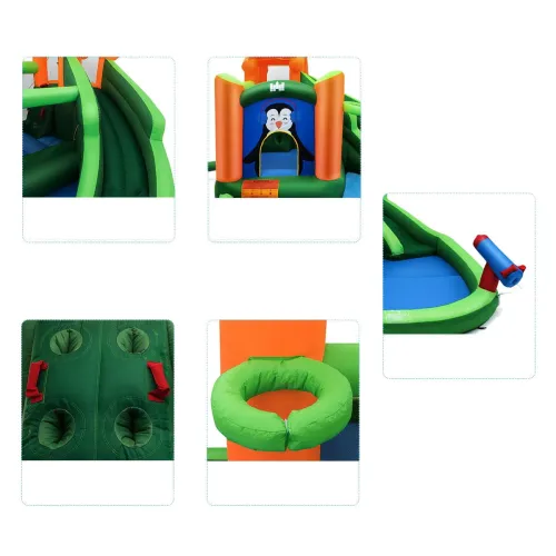- Кілька ігрових зон: Цей надувний майданчик має кілька ігрових зон: гірку, зону для стрибків, великий басейн, водяну гармату, баскетбольне кільце та стіну для скелелазіння. Діти можуть насолоджуватися плесканням, стрибками, лазінням, ковзанням та киданням кілець у цьому багатофункціональному надувному замку.
