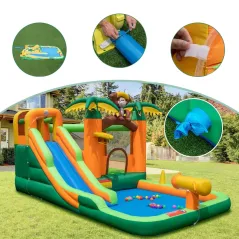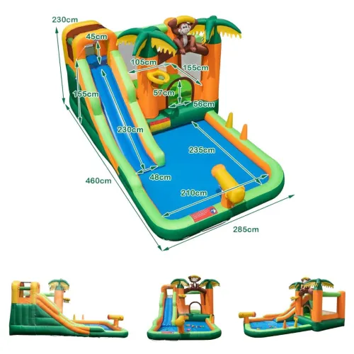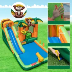 - Аквапарк 7-в-1: Цей надувний замок у тропічному стилі, прикрашений мавпами та пальмами, є справжнім хітом на дитячих вечірках. Обладнаний довгою водною гіркою, батутом, стіною для скелелазіння та басейном, він пропонує безліч атракціонів. Додаткові розваги, такі як баскетбольне кільце, кидання кілець та водяна гармата, забезпечують ще більше веселощів.