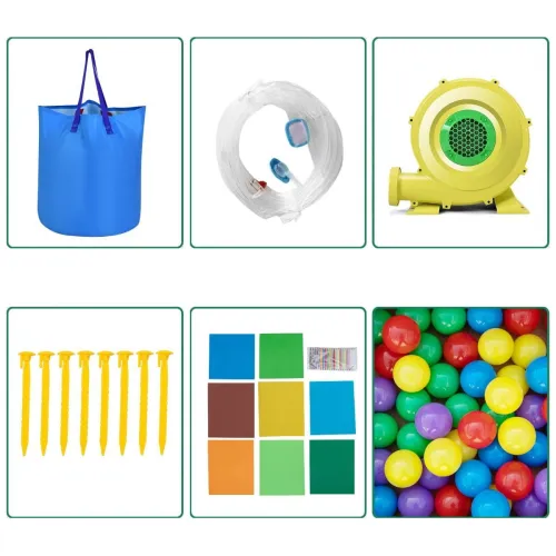 - Просте складання: Завдяки потужному компресору потужністю 680 Вт, надувний аквапарк швидко та легко збирається. Комплект також включає сумку для перенесення, ремкомплект, 8 кілочків та 50 м'ячів для зручного використання та зберігання.