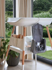 Верхній столик/стільниця розроблені таким чином, щоб зміна підгузків і догляд за дитиною були якомога простішими. Він виготовлений з високоякісного водонепроникного матеріалу PU і легко миється. Комплект включає практичну велику сіру полицю для зберігання та бічний органайзер з трьома кишенями, завдяки чому всі необхідні речі завжди під рукою. Це допомагає підтримувати порядок у дитячій кімнаті, дозволяючи батькам зосередитися на дитині.