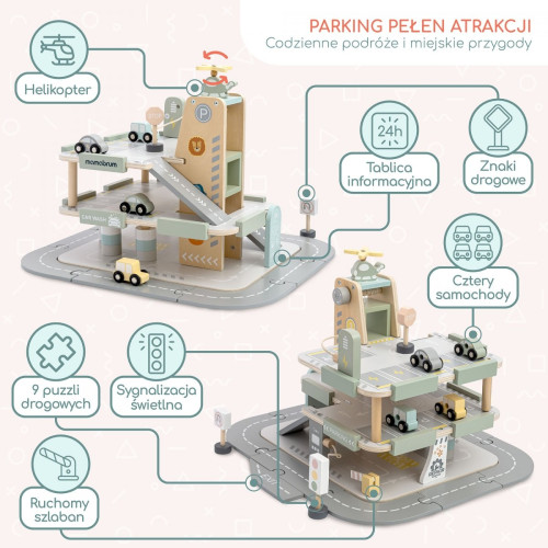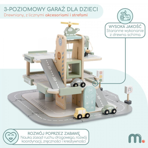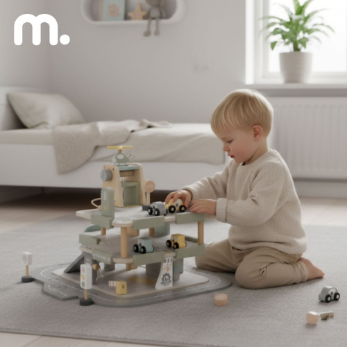 Дерев'яний трирівневий гараж для дітей з аксесуарами Mamabrum MAM271 GARAGE - подаруйте своєму малюку власний автомобільний центр! Дерев'яний трирівневий гараж Mamabrum — це не тільки паркінг, але й заправка, мийка, ремонтна майстерня, електрична зарядна станція, рухомий ліфт для автомобілів і майданчик для вертольотів. Завдяки багатому набору аксесуарів дитина може створювати безліч сценаріїв гри — від щоденних поїздок до захоплюючих міських пригод.