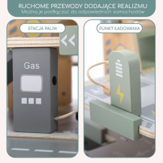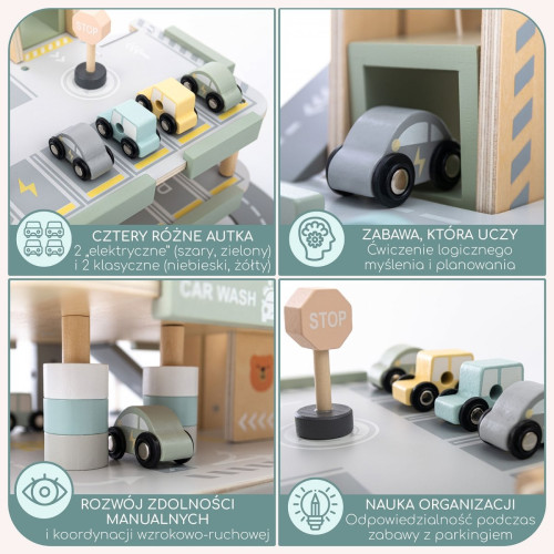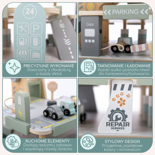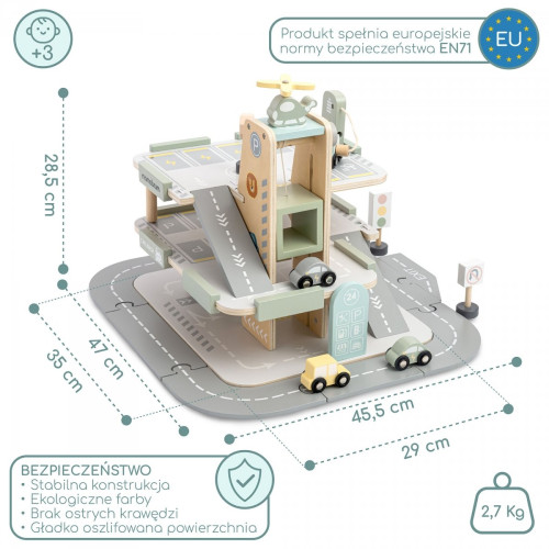 Кожен елемент гаража виготовлений з турботою про найменших. Гладко відшліфовані краї, стабільна конструкція та нетоксичні фарби роблять гру повністю безпечною. Продукт відповідає суворим європейським стандартам CE та EN71, що дає батькам впевненість, що дитина грається корисно та безпечно.