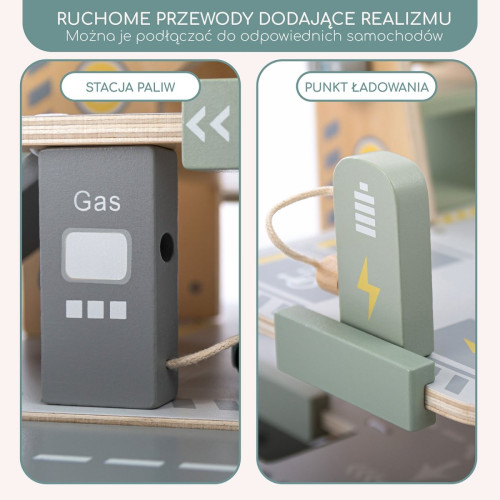- Автомобілі - чотири кольорові транспортні засоби: 2 електричні (сірий і зелений) з позначкою блискавки та 2 класичні (синій і жовтий). Кожен має отвір для заправки/заряджання.
