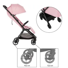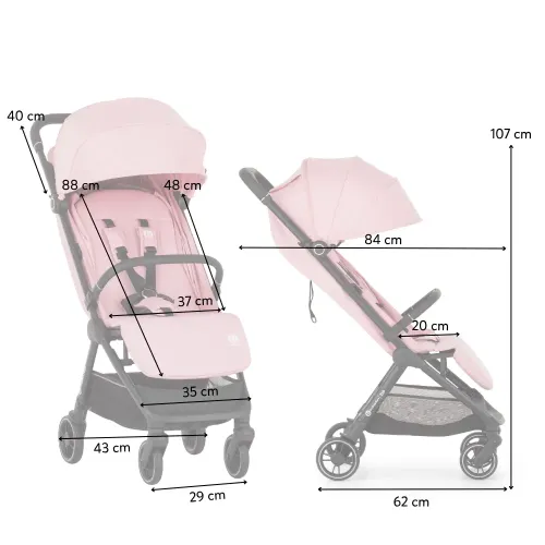 - Розміри розкладеного візка: 84 см (довжина від переднього колеса до ручки) × 43 см (ширина) × 107 см (висота)