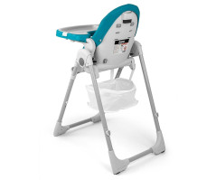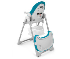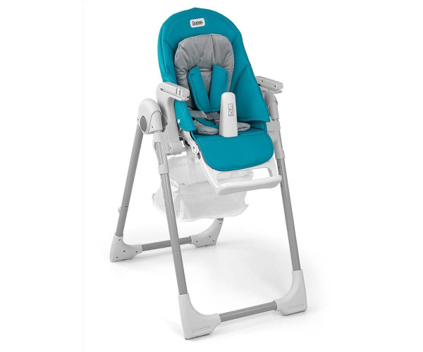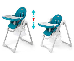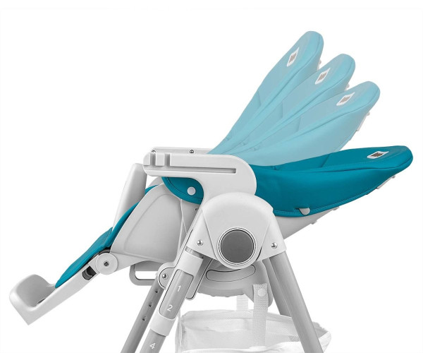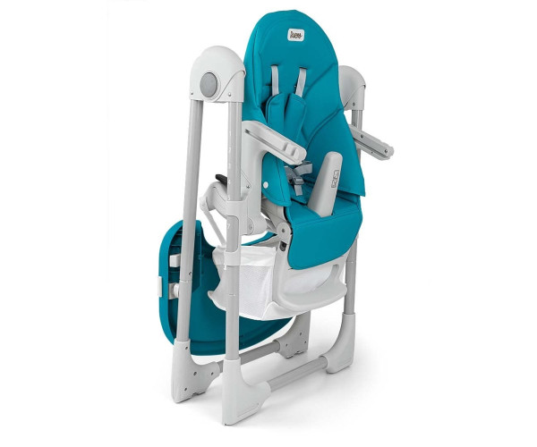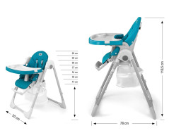 Оббивка стільчика виконана з екологічної шкіри і має додаткову м'яку вставку для найменших. Для безпеки дитини він оснащений 5-точковими регульованими ременями та додатковою бар'єром, що захищає від ковзання. Він також оснащений знімним підносом з накладкою. Ззаду спинки знаходиться кріплення для підвішування підноски, коли вона не використовується. Спинка і підніжка можуть розкладатися до горизонтального положення. Сидіння можна піднімати або опускати за 7-ступеневою шкалою, а в ніжки вбудовані гумові коліщатка. Всю конструкцію можна легко і плавно скласти до невеликих розмірів.