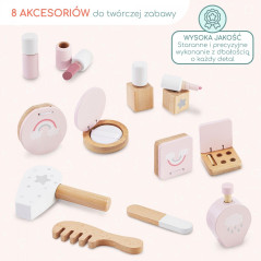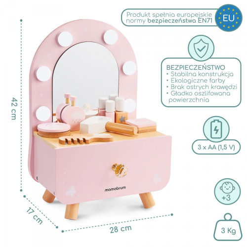 Туалетний столик відповідає європейським стандартам безпеки CE, EN71 та IEC 62115. Фарби, використані для обробки, нетоксичні та безпечні для дітей. Всі краї гладко відшліфовані, а конструкція стабільна - так, щоб щоденні ігри були не тільки красивими, але й, перш за все, безпечними.