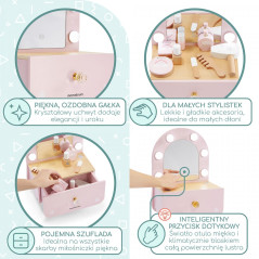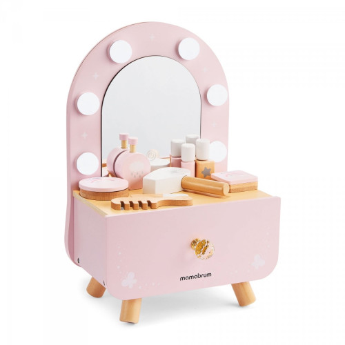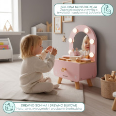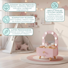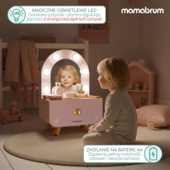 Дитячий міні туалетний столик з LED підсвічуванням Mamabrum MAM272 VANITY TABLE - це унікальна пропозиція для маленьких любительок краси та стилю! Цей чарівний, компактний предмет меблів поєднує в собі елегантність, функціональність та безпечну гру. Ідеально підходить для дітей, які люблять наслідувати дорослих і створювати власні чарівні ритуали догляду. Завдяки вбудованому LED-освітленню, реалістичним аксесуарам і невеликим розмірам, він додає дитячій кімнаті трохи казкового блиску - скрізь, де з'являється його власниця.