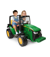 Детский электротрактор Peg-Perego JOHN DEERE DUAL FORCE 12V с прицепом - сенсационный трактор, питающийся от аккумулятора 12В. Современный 2-х местный трактор для детей от 3 до 8 лет. Изготовлен по лицензии JOHN DEERE. В комплекте с оригинальным большим прицепом.Внешний вид классического знаменитого трактора John Deere Ground Force от Peg Perego, но теперь в новой версии, увеличенной в 2 раза, с двумя сиденьями для двоих детей, так же надежен и крепок! Самый большой и мощный трактор, доступный на рынке! Если вы ищете самый лучший из детских тракторов на колесах для двоих детей, то вы попали в нужное место. Благодаря двум задним колесам и мощным двигателям (2х240 Вт) трактор с легкостью справляется с травой, гравием, выбоинами и холмами.