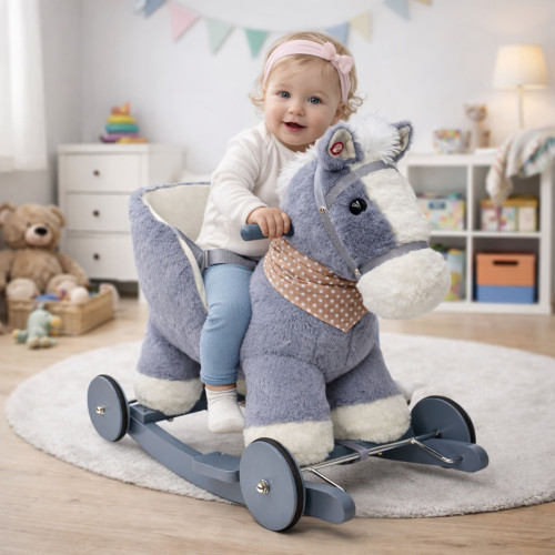 Стабильная конструкция на крепких полозьях обеспечивает безопасное качание, а колеса позволяют превратить игрушку в каталку для передвижения по дому. Лошадка разработана в сдержанной серой цветовой гамме, благодаря чему она идеально сочетается с оформлением современных и классических детских интерьеров. Мягкий плюшевый материал приятен на ощупь и обеспечивает ребенку комфорт во время игры, а правильно профилированная спинка повышает чувство безопасности.