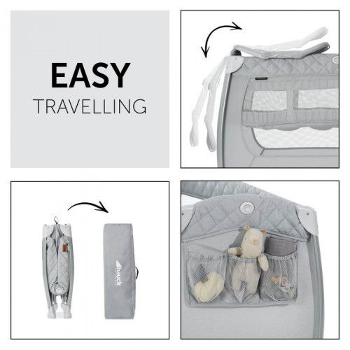 Манеж-кровать Hauck Play N Relax Center - дорожная кроватка 4-в-1 Premium в современном дизайне. Используйте его как прикроватную кроватку, пеленальный столик, манеж или как складную дорожную кроватку! Дорожная кроватка Play N Relax Center поставляется с полным набором аксессуаров и может использоваться четырьмя разными способами. Ваш ребенок может комфортно спать и играть, вы можете легко сменить подгузники и транспортировать его куда угодно, обеспечивая максимальную гибкость с самого рождения. Сложная база уже включена в комплект. Для дополнительного комфорта мы рекомендуем приобрести матрас размером 120х60 см (продается отдельно).Благодаря повышенному уровню для новорожденных вы можете удобно вкладывать ребенка, до которого можно легко добраться ночью. Вы можете сменить ребенку подгузники на пеленальном столике с входящим в комплект ремнем безопасности и положить малыша обратно в кроватку. Позже вы можете снять уровень и пеленальный столик. В боковых карманах вы всегда будете иметь под рукой влажные салфетки и другие необходимые вещи. Днем, благодаря двум встроенным колесам, вы можете без труда перемещать кроватку и использовать ее как манеж. Боковой выход на торце кроватки, который можно открыть только извне, предлагает развлечения для вашего малыша. Ваш ребенок может самостоятельно выползти и залезть назад, когда захочет отдохнуть. Нажатием кнопок, расположенных посреди всех четырех сторон, можно быстро сложить и разложить трубку. Компактно сложенную люльку и аксессуары можно легко убрать в сумку для переноски, входящую в комплект.