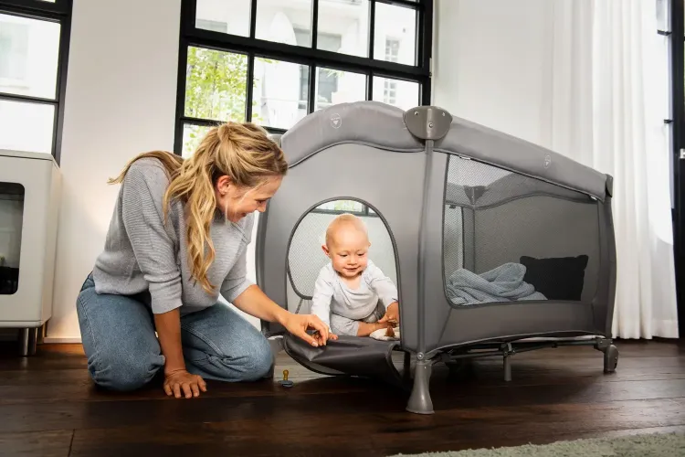 Ребёнок может не только спать, но и играть в Sleep'n Play Go Plus. Вы всегда можете смотреть на малыша благодаря обзорному окошку. Боковой выход дает свободу ползания.