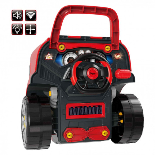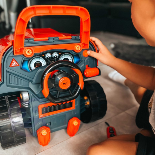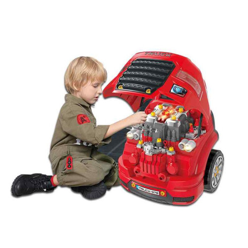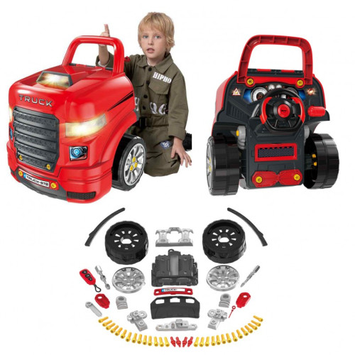 Набор маленького слесаря Woopie Большой грузовик 61 эл. 31262 - игрушка, имитирующая переднюю часть грузовика марки WOOPIE с подъемным капотом, рулем и приборной панелью с другой стороны. Открыв отсек под рулем, ребенок найдет внутри множество достопримечательностей в виде инструментов, ручек и винтов. Юный механик может выполнять много ремонтов и осмотров своего транспортного средства (например, колес, крыльев, двигателя, свечей зажигания, радиаторной решетки). Игрушка оснащена звуковым модулем (звуки двигателя и клаксона) и световым (светящиеся фары). Дополнительно в комплекте есть пульт дистанционного управления, позволяющий управлять модулями. Для снятия колес можно использовать подъемник, размещенный в игрушке. Безусловно, это уникальный набор, предлагающий множество возможностей для игры.