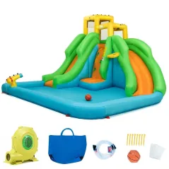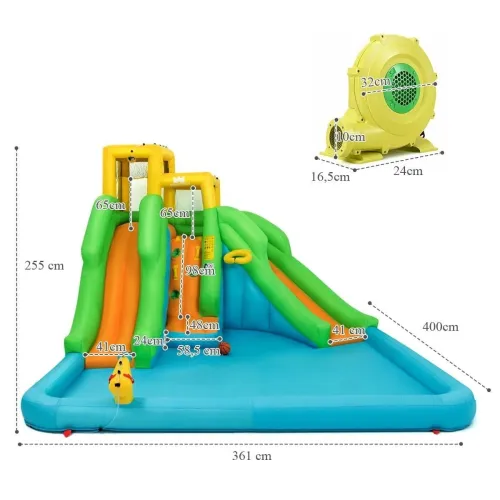 - Быстрое надувание и хранение: Оснащенный вентилятором мощностью 480 Вт, аквапарк надувается в считанные минуты. После игры его можно быстро сдуть с помощью выпускного клапана, затем сложить и хранить в сумке для переноски.