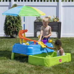 Водный столик с зонтиком STEP2 414599 - этот детский водный игровой стол 2-в-1 включает в себя большой зонтик, лодочки, пусковые установки и подвижное наливное устройство, которое служит системой для наливания воды в бассейн, установленный внизу. Бассейн можно спрятать под стол, чтобы он занимал меньше места, когда игра заканчивается. Верхняя часть вмещает 15 литров воды, а нижняя - около 60 литров.