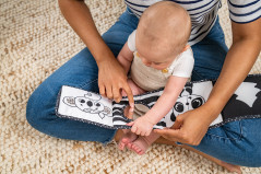 Буклет поддерживает зрение ребенка благодаря контрастным черно-белым цветам на одной стороне, идеально подходящей для детей младшего возраста, и цветному игровому дизайну, предназначенному для детей постарше, на другой стороне.