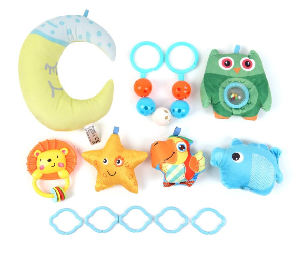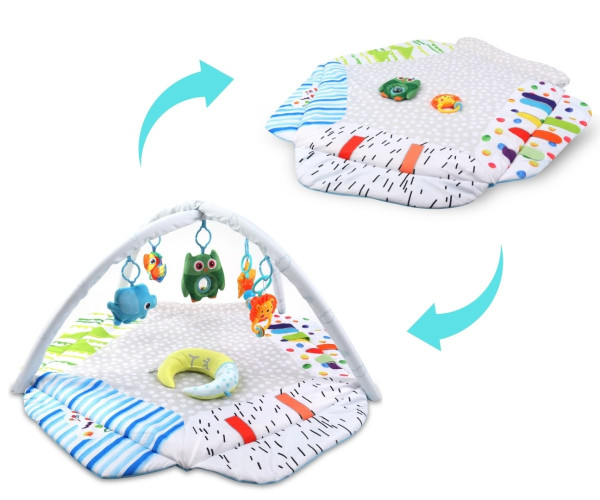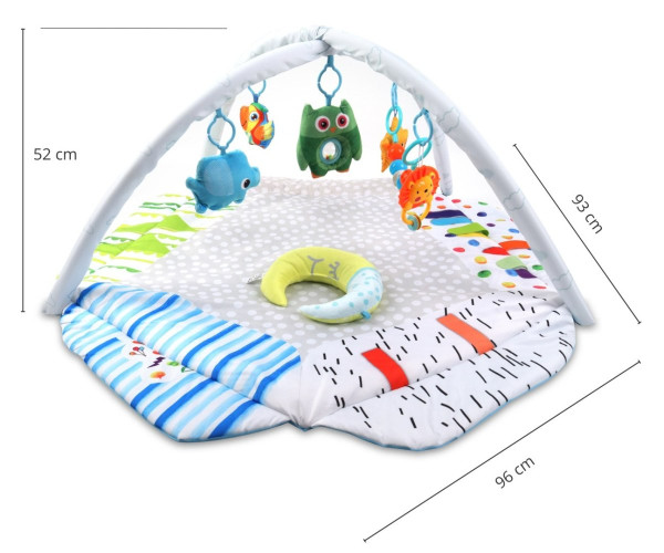 Развивающий коврик помогает научить малыша хватать и распознавать формы. Он поощряет активность и творческую игру. Подвески развивают зрение и осязание, а также моторную координацию.