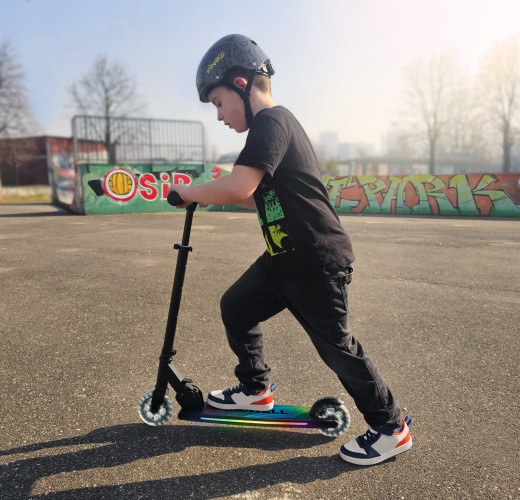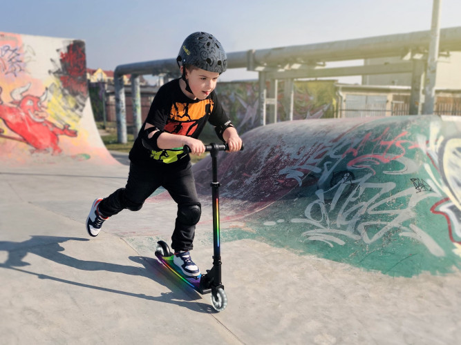 - Благодаря колесам 120 мм, самокат маневренный и легкий в езде.