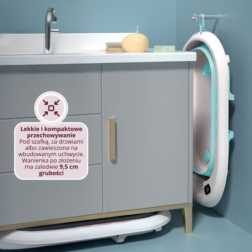 Ванночка Holly состоит в два простых шага – в сложенном виде ее толщина составляет всего 9,5 см, что позволяет хранить ее под шкафом или повесить на крючок. Она не занимает ценного места, а благодаря специальной подвесной петле она всегда под рукой. На верхнем краю есть удобная полка для косметики и банных принадлежностей, где можно хранить гель, мыло или губку – больше не нужно возиться во время купания. Рядом с ней расположен практичный держатель для душевой воронки, который обеспечивает легкий доступ – идеально подходит для наполнения ванны или быстрого ополаскивания малыша. После купания воду можно легко слить благодаря сливу с гибкой трубкой и пробкой, что позволяет удобно опорожнять ванну без поднятия и брызг.