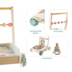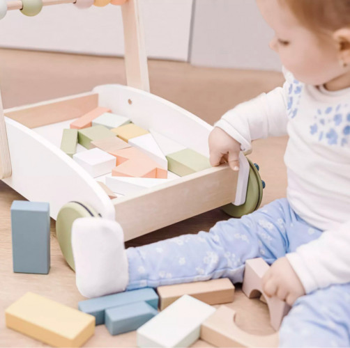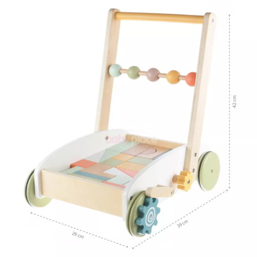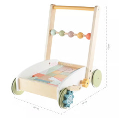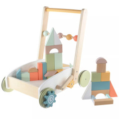 Деревянные обучающие ходунки Zopa ZOP086078 - воображение не имеет предела. Компактная тележка с деревянной ручкой наполнена разноцветными кубиками, из которых ребенок может построить все, что угодно. Если кубики вынуть из тележки, его можно использовать для перевозки других игрушек. Ручка имеет деревянные шарики, которые можно передвигать с одной стороны на другую. Крепкие колеса подходят для любого типа полов. Игрушка развивает координацию, моторику, пространственное воображение и фантазию.
